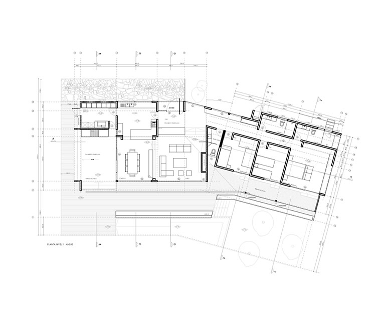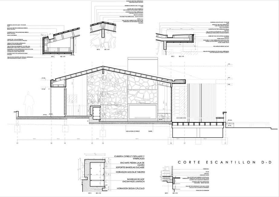 El zócalo y muros de la casa se ventilan, disminuyendo la humedad interna de pisos y muros. Las piedras lajas fueron extraídas de una cantera habilitada en el mismo sitio. Con el fin de generar continuidad con el zócalo y trabajar la quinta fachada, el techo también fue revestido con piedra laja.