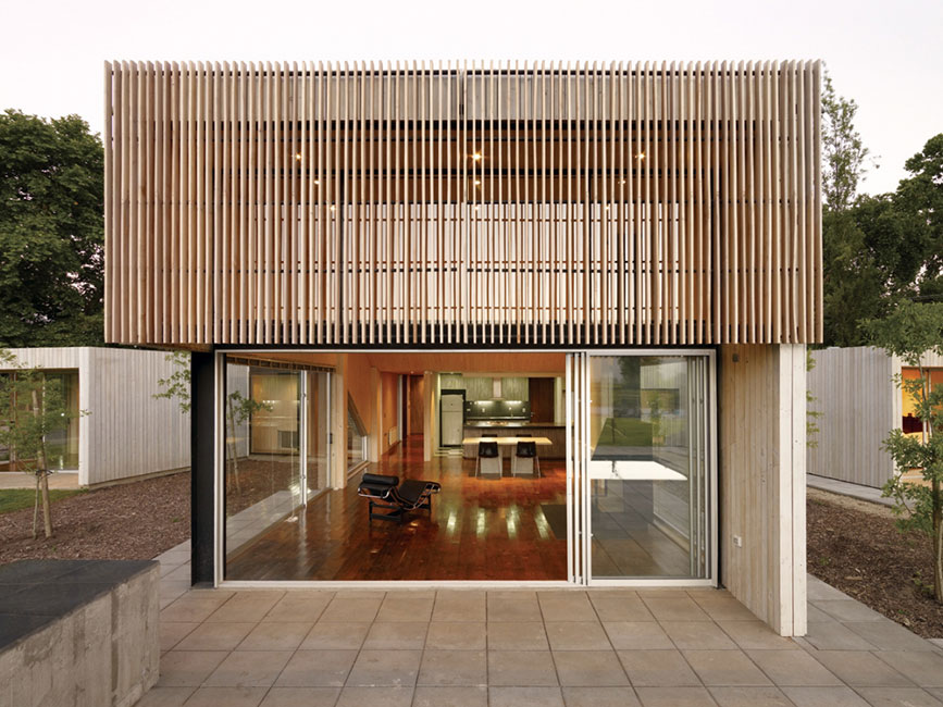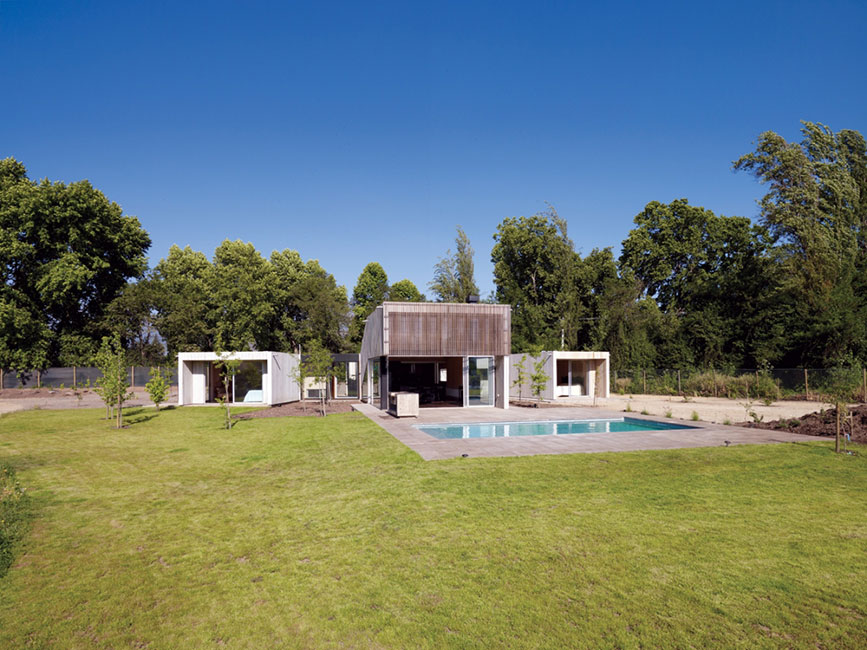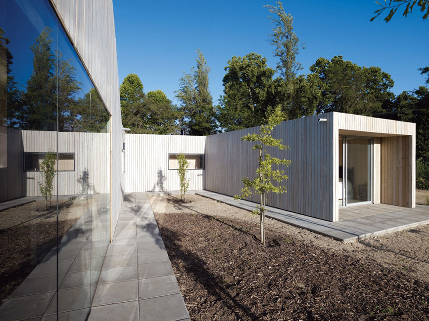 Patios verdes (sombras), ventilación cruzada y abertura a los vientos predominantes para enfriar la casa, muros ventilados de madera color blanco, doble piel de celosía de madera hacia el poniente y techo pintado blanco.