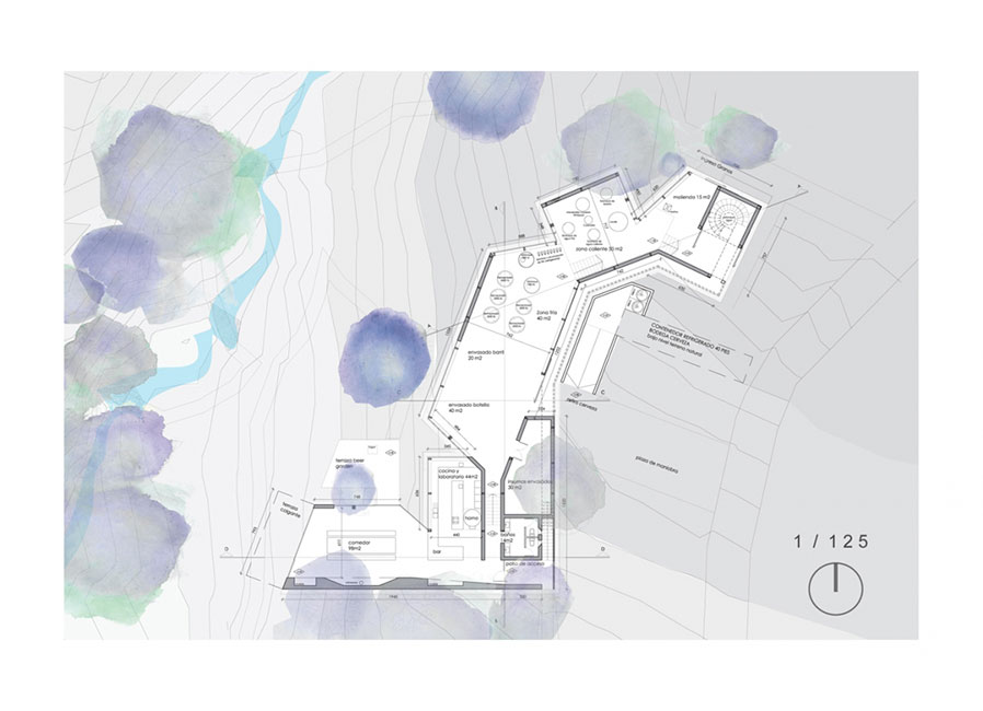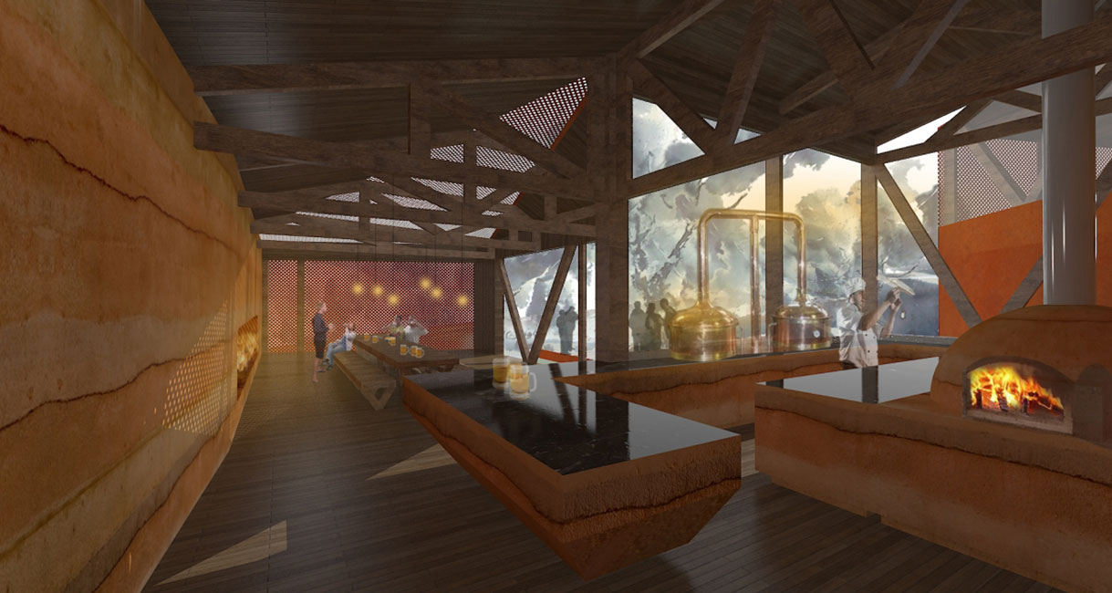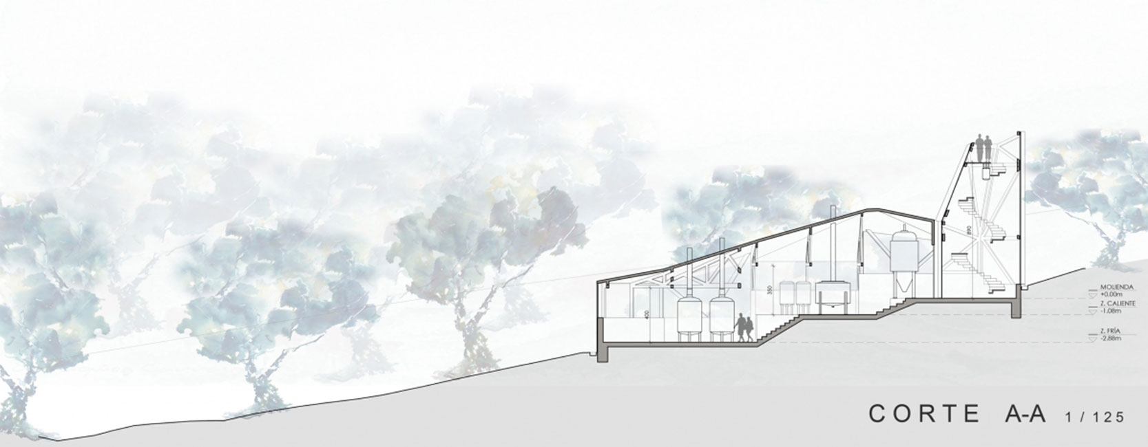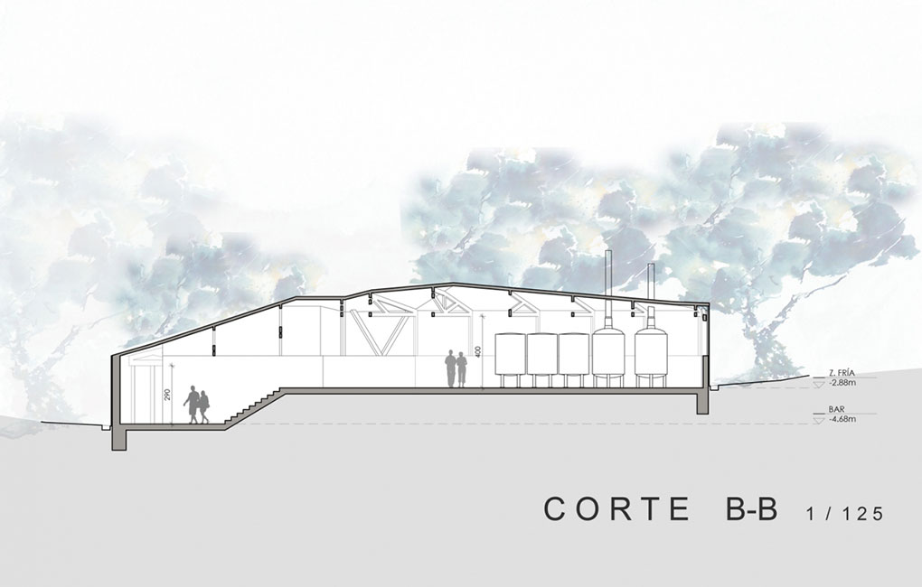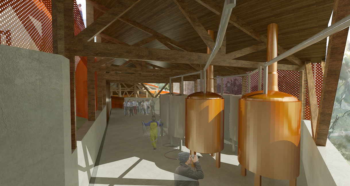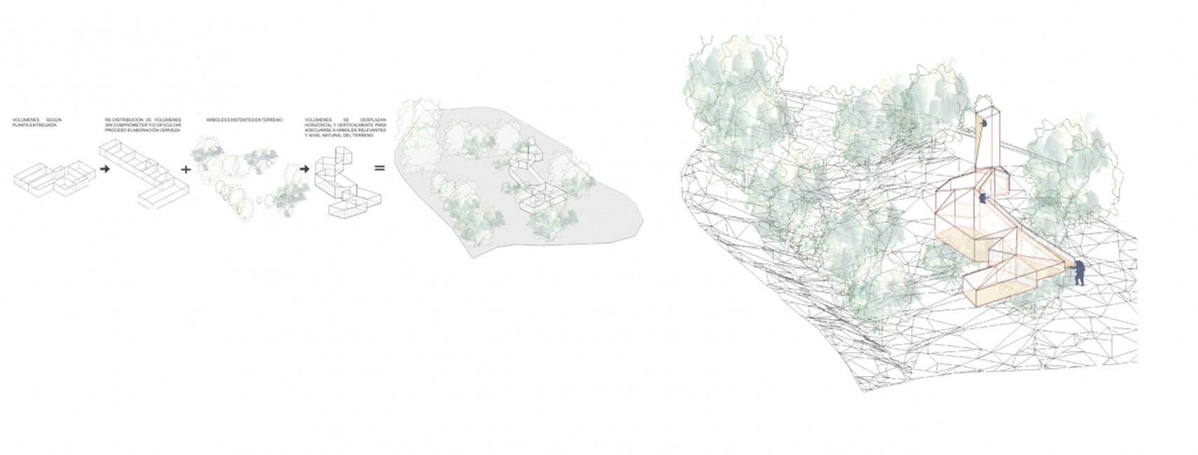 Adicionalmente, se propone un recorrido por el interior del edificio (recorrido interior, imagen 5), el cual se puede realizar desde el punto más alto, accediendo a través de la torre de observación y agua, bajando en la dirección de la pendiente del terreno siguiendo el movimiento descendente de agua y cerveza, o acceder desde la quebrada al bar/restaurant La Montaña y subir en dirección contraria hacia la torre.