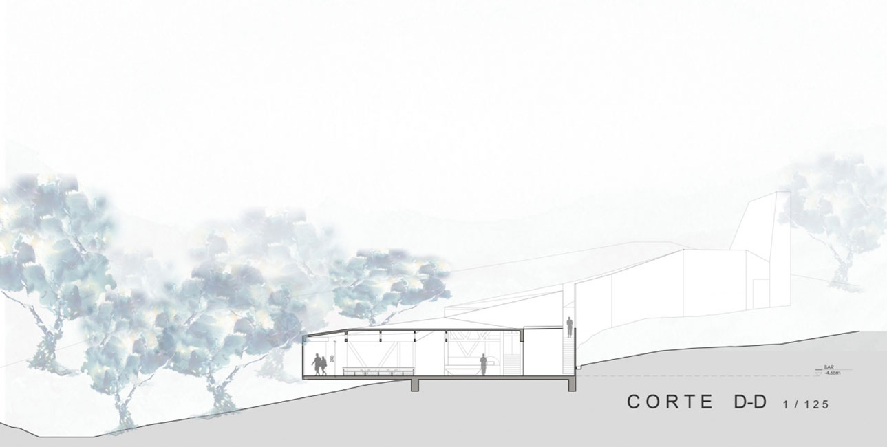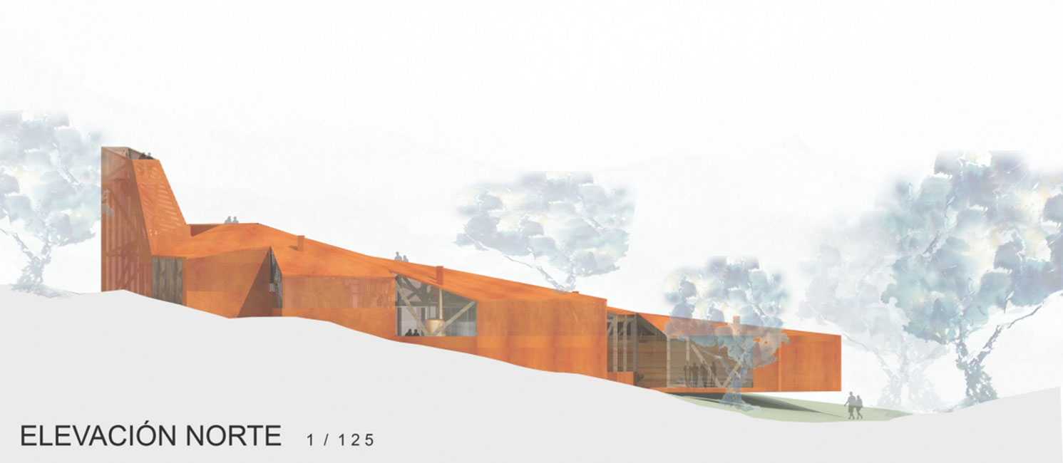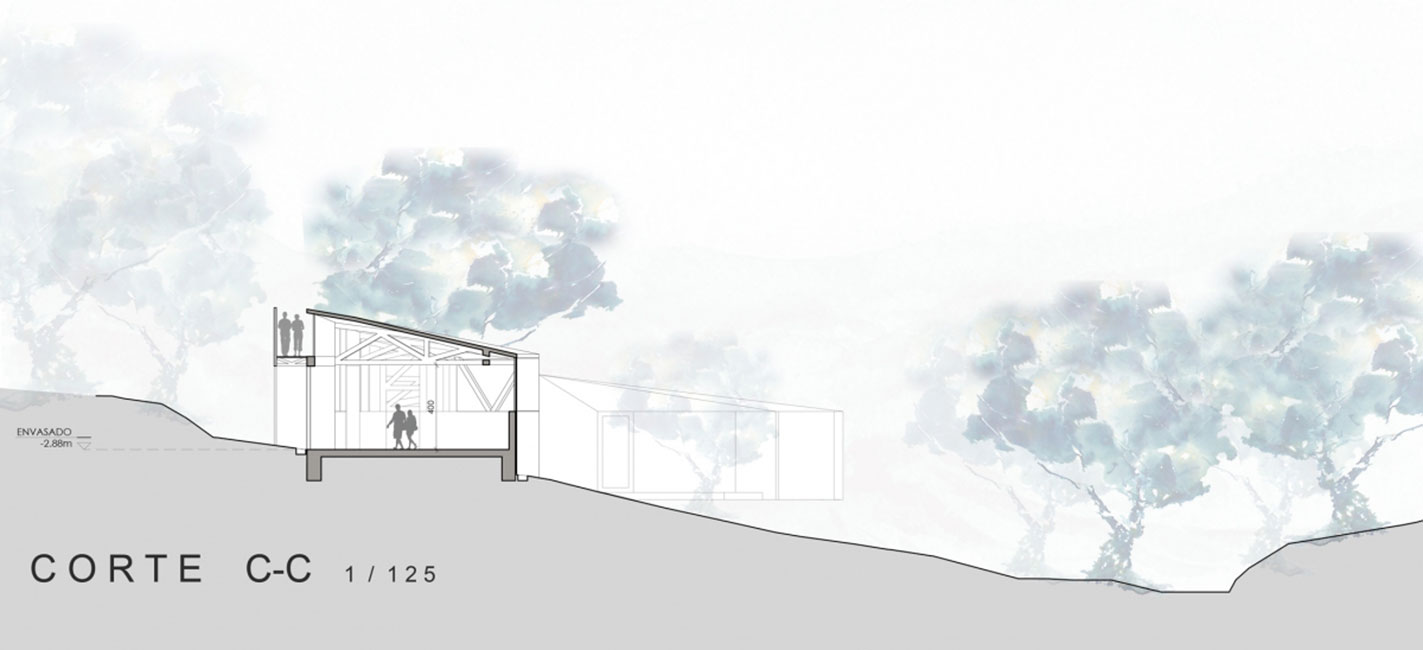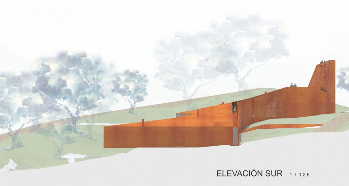 Desde el emplazamiento en un espacio “V”, que homologa el contexto mayor del valle fluvial cordillerano, el proyecto pretende construir no sólo un edificio habitable, sino que también un paisaje construido habitable, que reviva la experiencia de transitar desde la base hasta la cumbre de la montaña y los sucesos que puedan ocurrir en esta cruzada.