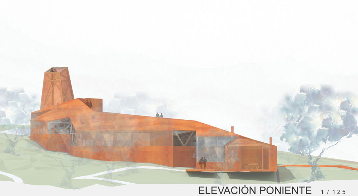 De esta manera, el proyecto construye una nueva geografía sobre la loma donde se ubica, inspirado en el lomo de un cordón montañoso, a través del cual los antiguos habitantes incas caminaban atravesando la puerta sur del imperio hacia el valle de Santiago. Así, se replica el recorrido de las aguas, desde su punto más alto, bajando por gravedad y direccionadas por la pendiente. El cual se enfatiza con la ubicación de los dos estanques de acumulación de agua en alto sobre una torre que representa el punto alto de la cumbre, lugar al que el hombre accede para obtener una vista panorámica y comprender la totalidad del paisaje a una escala más amplia.