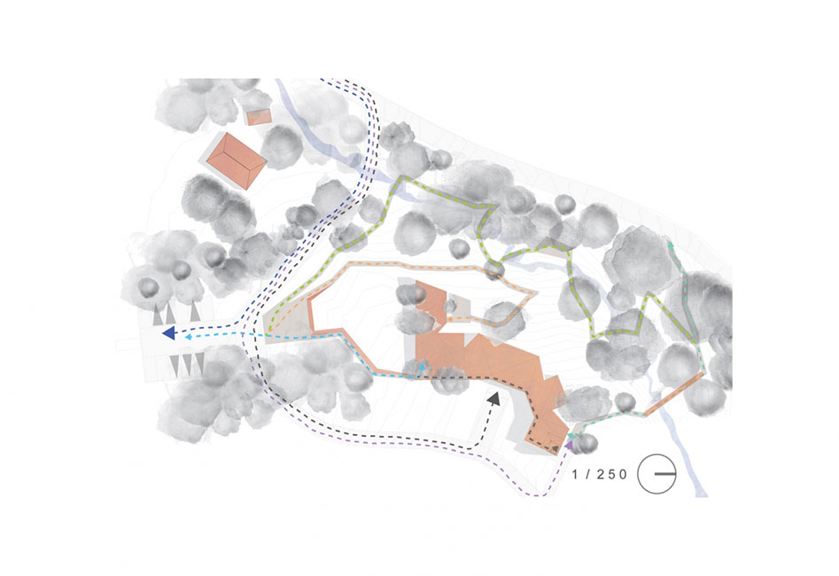 La llegada a la torre se propone como un recorrido perimetral a través de la techumbre del edificio (pasarela 1, planta escala 1:250), desde el punto más bajo al más alto del sitio. Este mismo recorrido exterior por la techumbre del edificio, conecta con el recorrido exterior propuesto para la quebrada a través de puentes y senderos peatonales (pasarela 2, planta escala 1:250), constituyendo un paseo continuo por los diferentes puntos y situaciones que suceden en el contexto de emplazamiento (1 ha. aproximadamente).