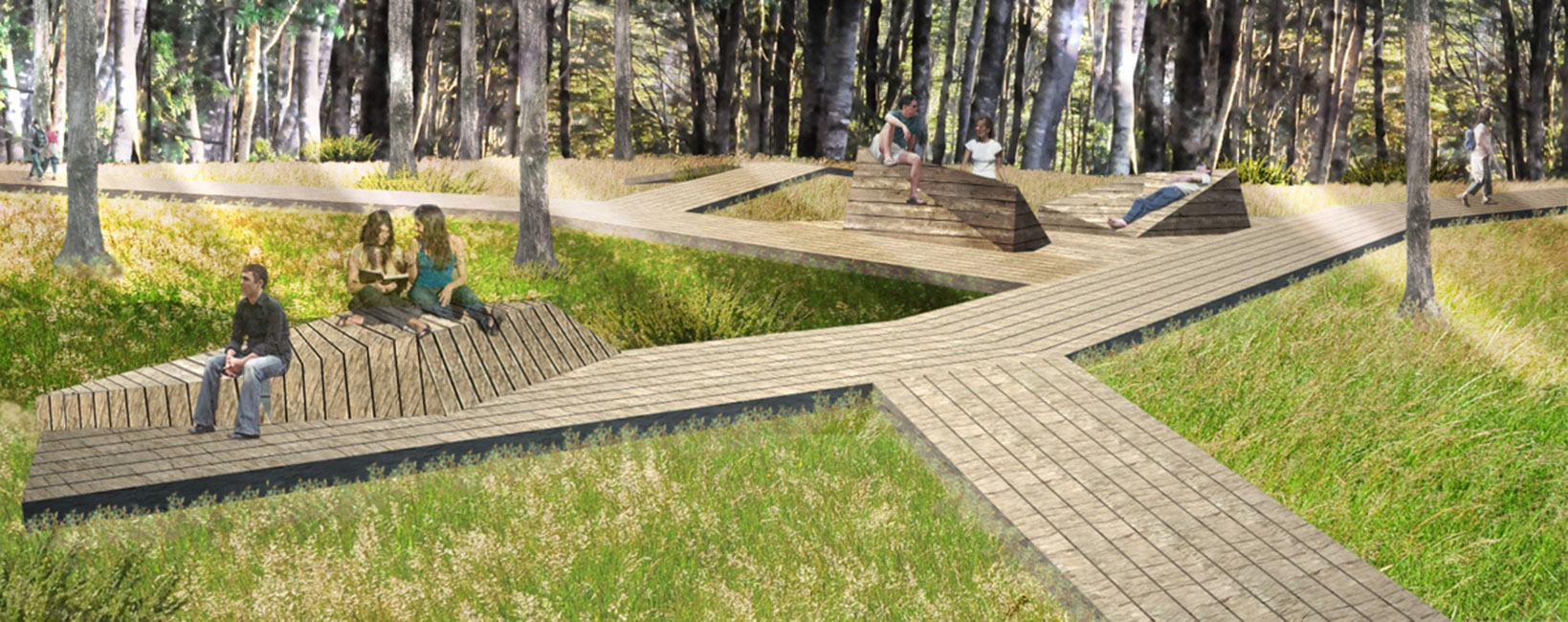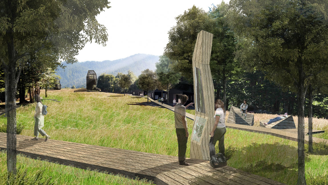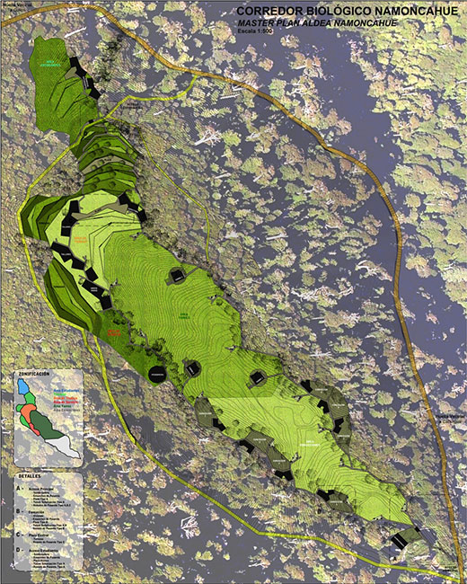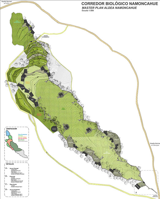 Dentro del plan maestro del corredor, se propone desarrollar una Aldea Científica como lugar de congregación y distribución hacia otras áreas del parque, en un espacio de 7 ha. La circulación y edificios se ubican, en su mayor parte, dentro de esta área. Respecto a la circulación, conceptualmente nombramos la estrategia “Arborización”, respondiendo la pregunta: ¿Cómo habitar un lugar de manera flexible y con un sistema abierto? Que pueda adaptarse, durante la construcción, a los cambios en la topografía y árboles imperceptibles en el plano topográfico al momento de proyectar. La Arborización corresponde a las circulaciones de manera ramificada y como un sistema abierto que se adapta a diferentes situaciones y al que se le agrega un set de soluciones constructivas en relación a las condiciones del lugar.