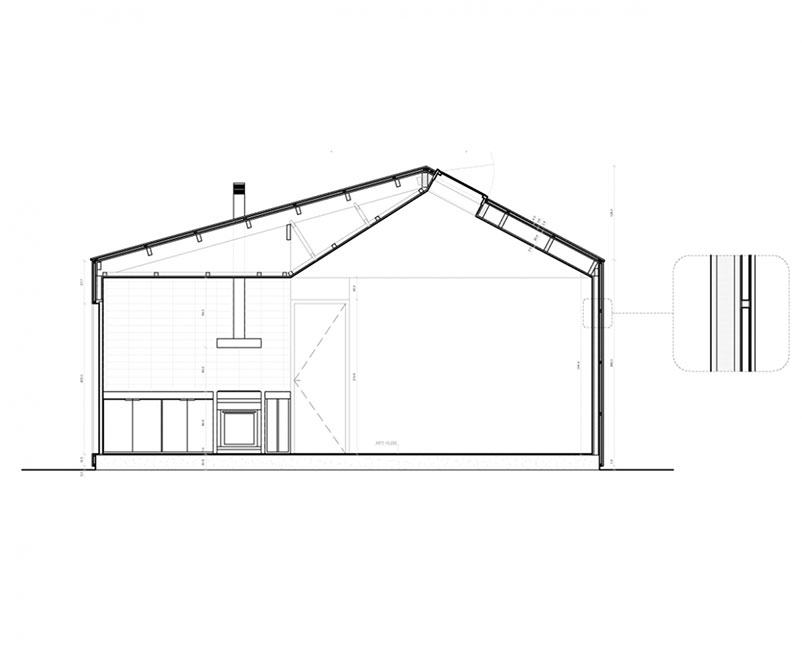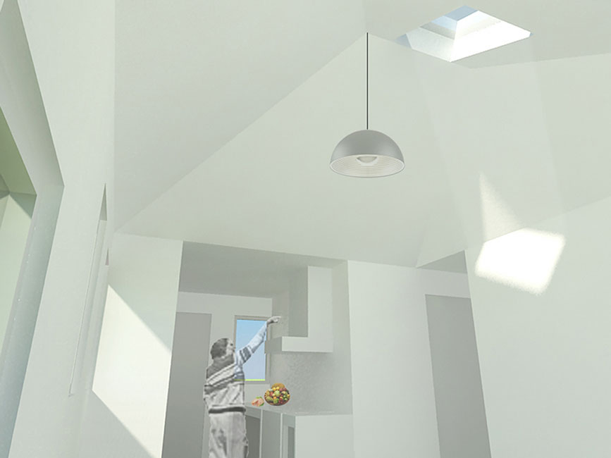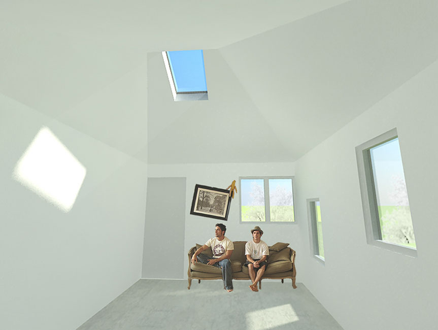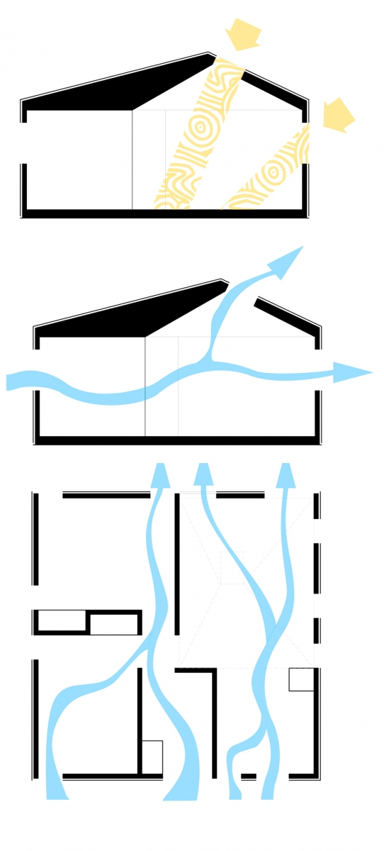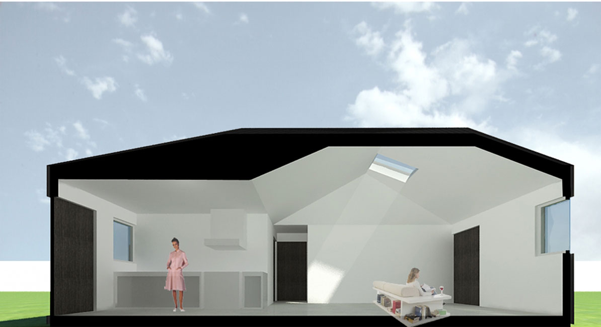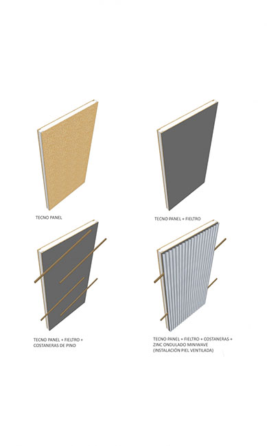 Aplicamos dos soluciones: piel ventilada en muros y techo, que consiste en un espacio de cinco cms. por el cual el aire circula, enfriando en verano y eliminando la humedad en invierno. Velux, ventana termopanel ubicada en el techo inclinado de la vivienda que aporta luminosidad al interior, además, aumenta la temperatura y permite mayor ventilación en los días calurosos. El segundo propósito se resuelve con una planta simple y funcional, donde se concentra la red húmeda para ahorrar costos y se separan los espacios comunes de los privados de la vivienda.