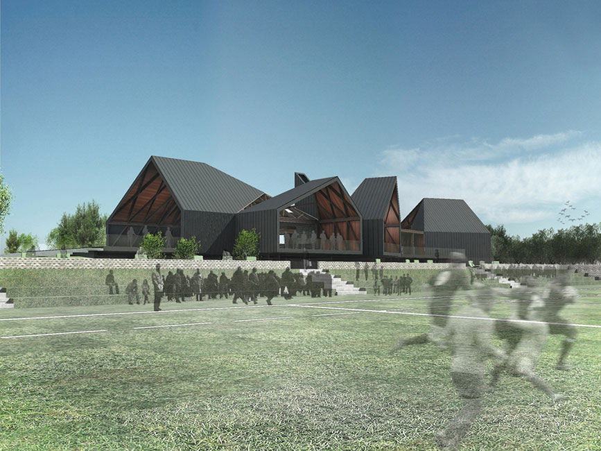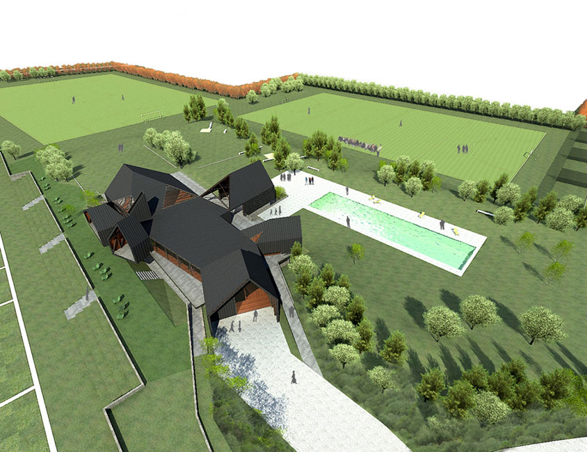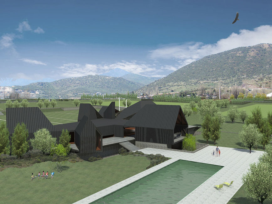 La propuesta del plan maestro, principalmente, es generar un núcleo verde central de aproximadamente 1 ha., en el cual se emplaza el club house. El proyecto de paisajismo, basado en el concepto de reproducir un ecosistema local, se hace cargo de los movimientos de tierras de la construcción del club house y canchas, incorporándolos a la construcción de éste.